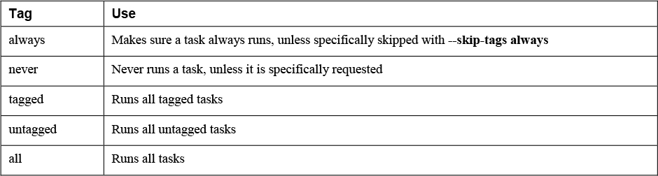 Apart from these special tags, you might also want to set a debug tag to easily identify tasks that should be run only if you specifically want to run debug tasks as well. If combined with the never tag, the task that is tagged with the debug,never tasks runs only if the debug tag is specifically requested. So in case you want to run the entire playbook, including tasks that have been tagged with debug, you need to use the ansible-playbook --tags all,debug command. In Exercise 11-3 you can see how this can be used to optimize the playbook that was previously used in Exercise 11-2.