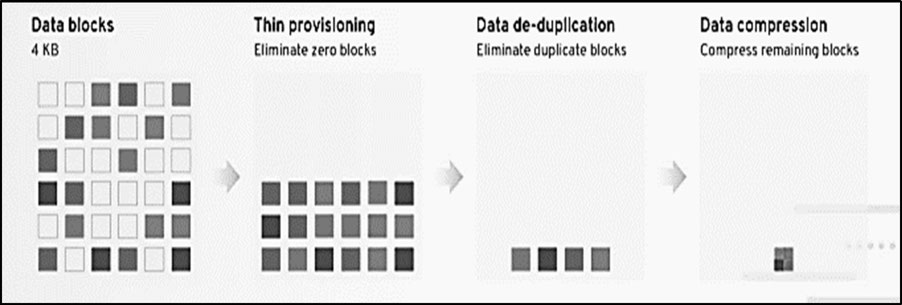 Employs thin provisioning, de-duplication, and compression technologies to help realize the goals.