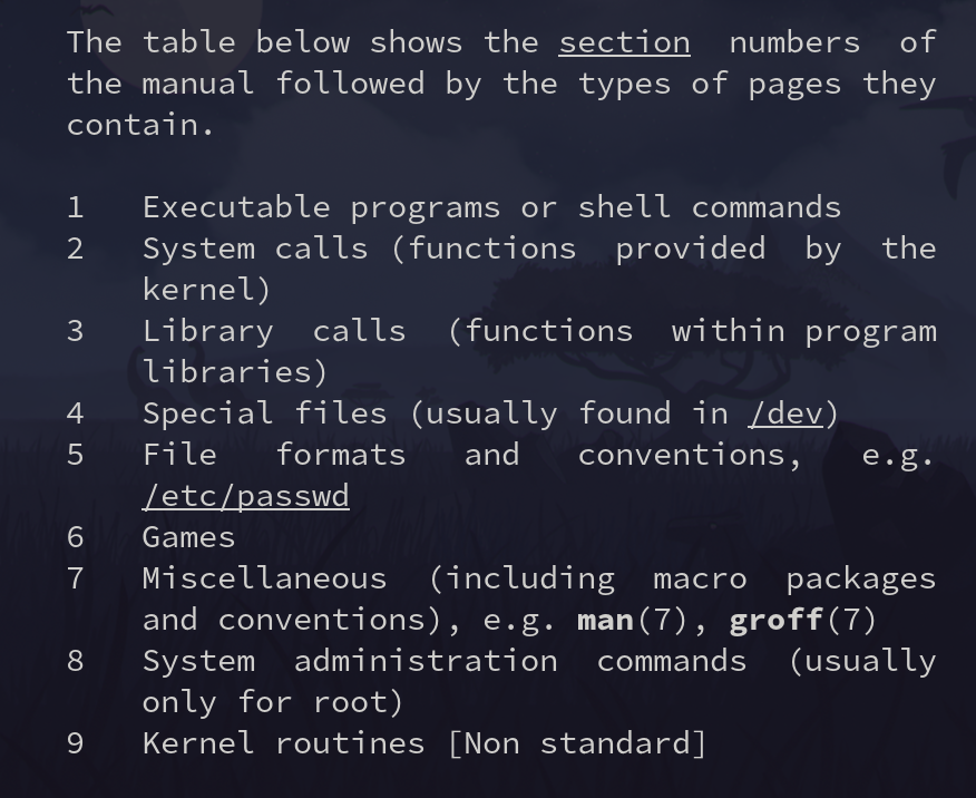 OPTIONS [Normally only in Sections 1, 8] EXIT STATUS [Normally only in Sections 1, 8] RETURN VALUE [Normally only in Sections 2, 3] ERRORS [Typically only in Sections 2, 3] ENVIRONMENT