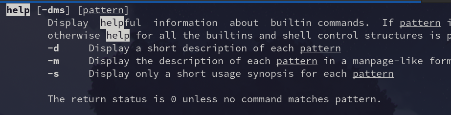 help: help [-dms][pattern ...] Display information about builtin commands.